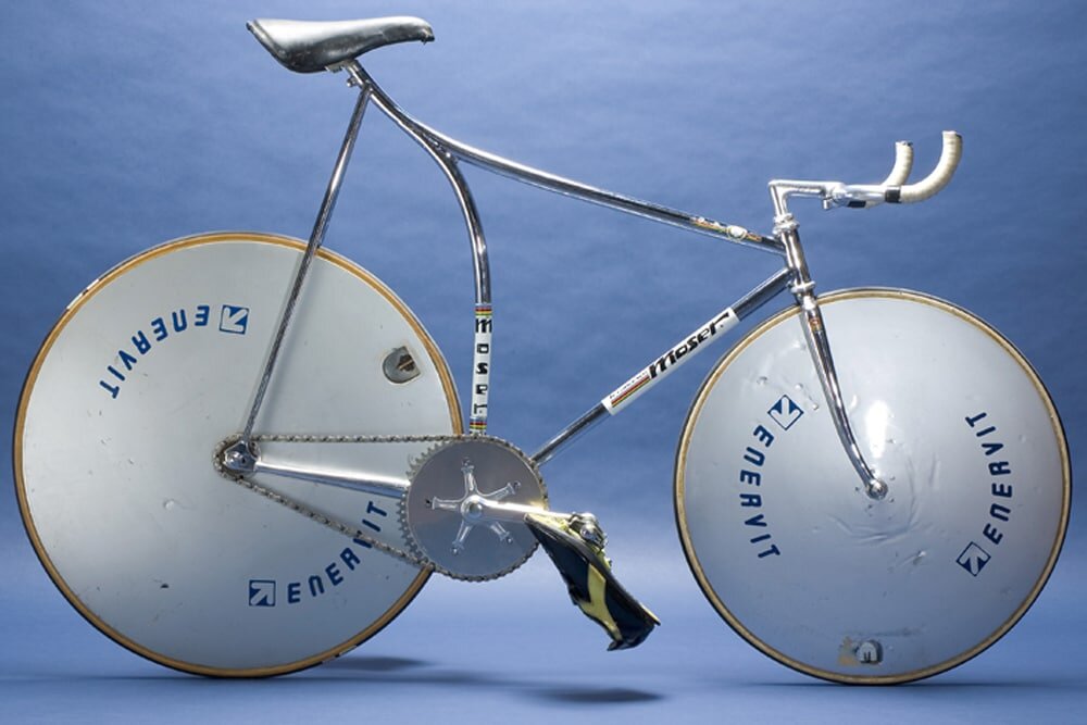 В 1984 году Франческо Мозер побил рекорд часа, который поставил Эдди Меркс в далеком 1972 году. Яркой деталью велосипеда стали колеса-диски, попавшие в новостные выпуски. В 1985 году Mavic с помпой презентовал свою серийную разработку – карбоновые дисковые колеса Mavic Comete. Французы разрабатывали тему более десяти лет – еще в 1973 году тестировали колеса из стекловолокна в своем исследовательском бюро. Инженеры Mavic обнаружили, что закрытое колесо может быстрее рассекать воздух. Они установили, что наиболее эффективной является чечевицеобразная (линзообразная), а не плоская форма – меньше завихрений. Меньшая турбулентность ветра означает меньшее сопротивление. Плоское колесо с углеродным диском имеет аэродинамическое сопротивление 97 грамм. Для сравнения: аэродинамическое сопротивление стандартного 18-спицевого колеса составляет 154 грамма. «Кометы» дебютировали на Тур де Франс, и к концу сезона профессиональные велосипедисты активно использовали их в прологах и разделках. В с