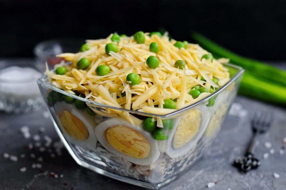 Рецепт оригинального салата "Солнышко" с ярким вкусом и интересным внешним видом. Выкладывается он слоями в определенной последовательности. Для подачи лучше использовать именно стекленную емкость, чтобы были видны крупные кружочки яиц. Слои пропитываются орехово-чесночным соусом на майонезной основе. Нежное куриное мясо отлично сочетается с жареными грибами, маринованными огурцами и зеленым горошком. Салат отлично подойдет для любого праздника, удивит и порадует гостей. Ингредиенты: Приготовление: Отдельно приготовьте соус для смазывания слоев салата. Петрушку мелко нашинкуйте. Грецкие орехи перебейте блендером в среднюю крошку. Чеснок пропустите через пресс. Зелень, чеснок и орехи добавьте в майонез, присыпьте специями, перемешайте. На сковороде в масле обжарьте репчатый лук, нарезанный кубиками. Сырые шампиньоны нарежьте, добавьте к луку, продолжайте жарить около 10 минут до полного испарения грибного сока, присыпьте солью и перцем. Куриное филе отварите в подсоленной воде до готовн