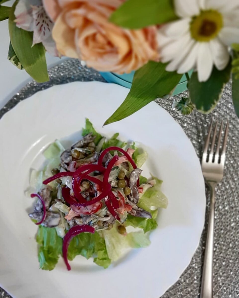 Подавать на овощной подушке, салат выложить горкой, сверху украсить луком