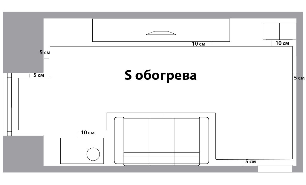 Перед тем, как приобретать электрический тёплый пол, необходимо рассчитать площадь его установки. После этого — определить, какая мощность тёплого пола потребуется для выбранного помещения. Первый пункт зависит от формулы, второй — от цели обогрева и от типа помещения. Расчет площади Площадь укладки тёплого пола рассчитывается по формуле: Sтп = Sобщ — (Sотсупов + Sмебели) Что такое Sотступов + Sмебели? Тёплый пол нельзя размещать под корпусной мебелью и крупной бытовой техникой. Шкафы, гардеробные, серванты, холодильники, стиральные машины и т.д. — это всё попадает в категорию корпусной мебели. Если под неё смонтировать тёплый пол, возникнет нарушение в теплоотдаче. Тепло, выделяемое системой, не будет подниматься вверх в заставленных областях, нарушится циркуляция. В результате этого кабель начнет перегреваться и постепенно выходить из строя. Как итог: пострадает вся система обогрева пола. Поэтому необходимо вычесть из общей площади площадь мебели с учетом отступов от неё и от стен в