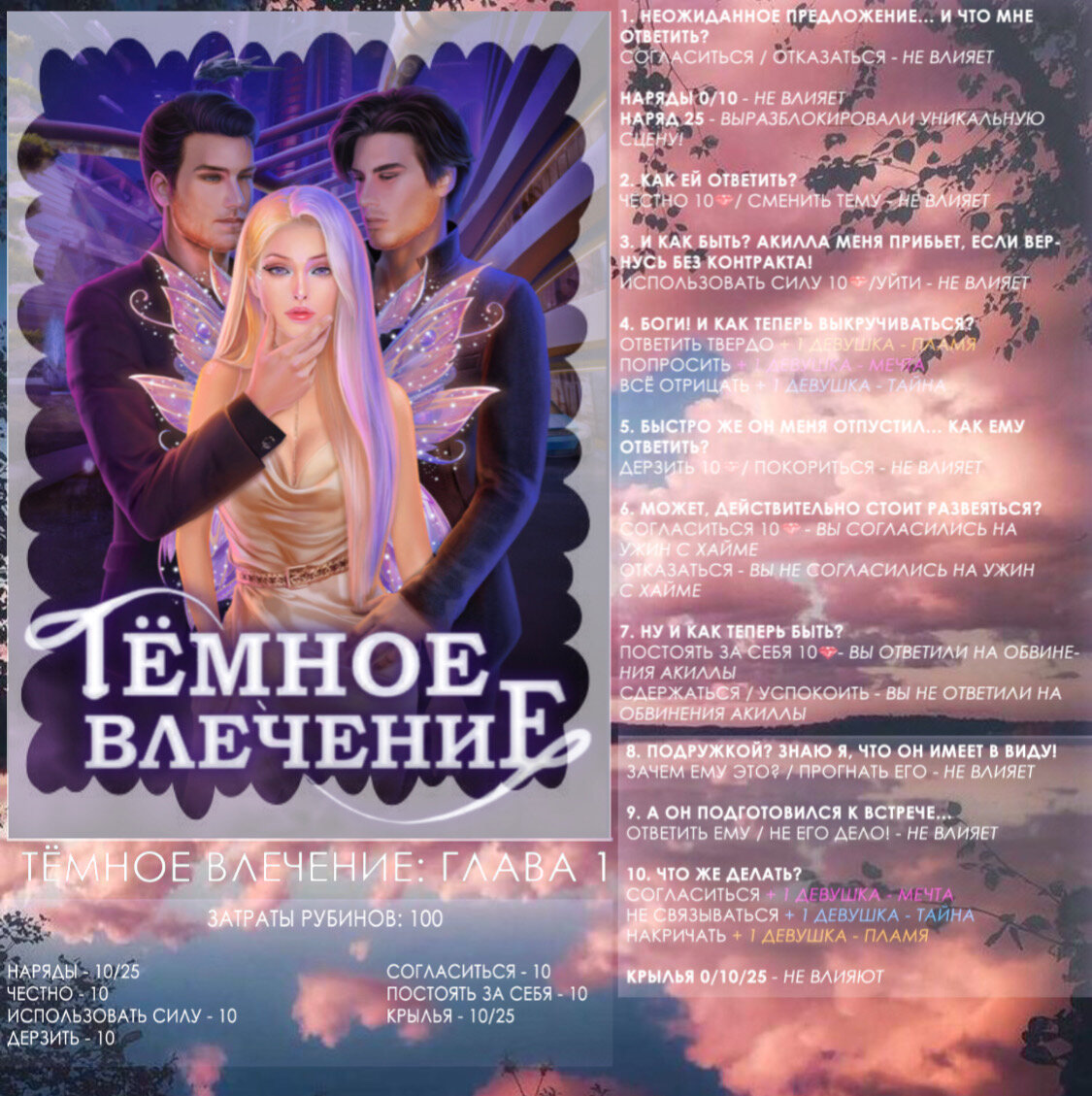 NOVELS ТЁМНОЕ ВЛЕЧЕНИЕ Сезон 1 Глава 1 Готовый Гайд Ниже я поэтапно покажу вам прохождение по первой главе. Для начала выберите внешность вашей героини: Дальше вы встанете перед выборами, которые так или иначе повлияют на дальнейший сюжет! Приятной и удобной вам игры!