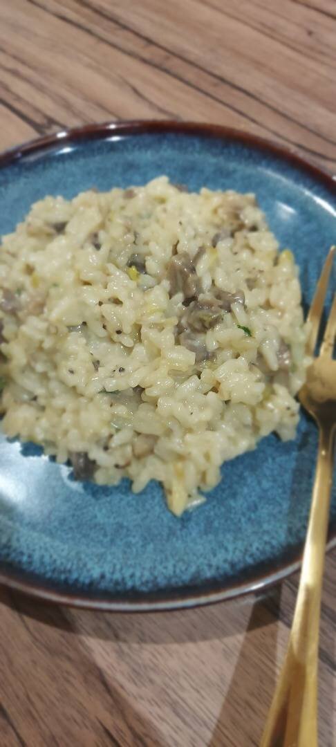 Буйство вкуса, наслаждение и удовлетворение, это эпитеты, которые вызывает это блюдо! Ингредиенты: риса для Ризотто (зёрна риса должны быть круглые), шампиньонов, лука порея, белого сухого вина, овощного бульона, сок с 0,5 лимона, лимонная цедра, оливкового масла, сливочного масла, тёртого пармезана, соль, перец, петрушка Способ приготовления: Мелко нарезаем белую часть лука порея, шампиньоны режем мелко. Нагреваем сковороду с 2 ст л оливкового масла. Обжариваем порей, добавляем шампиньоны и обжариваем пока не испарится жидкость. Высыпаем рис, помешивая даём соединиться с овощами. Вливаем вино и даём испариться. Небольшими порциями добавляем бульон, пока рис его будет впитывать станет готов. Примерно 15 мин протушиваем. Добавляем сок лимона и цедру, солим, перчим. Когда рис уже готов, добавляем пармезан и сливочное масло. Посыпаем мелко нарезанной петрушкой.
