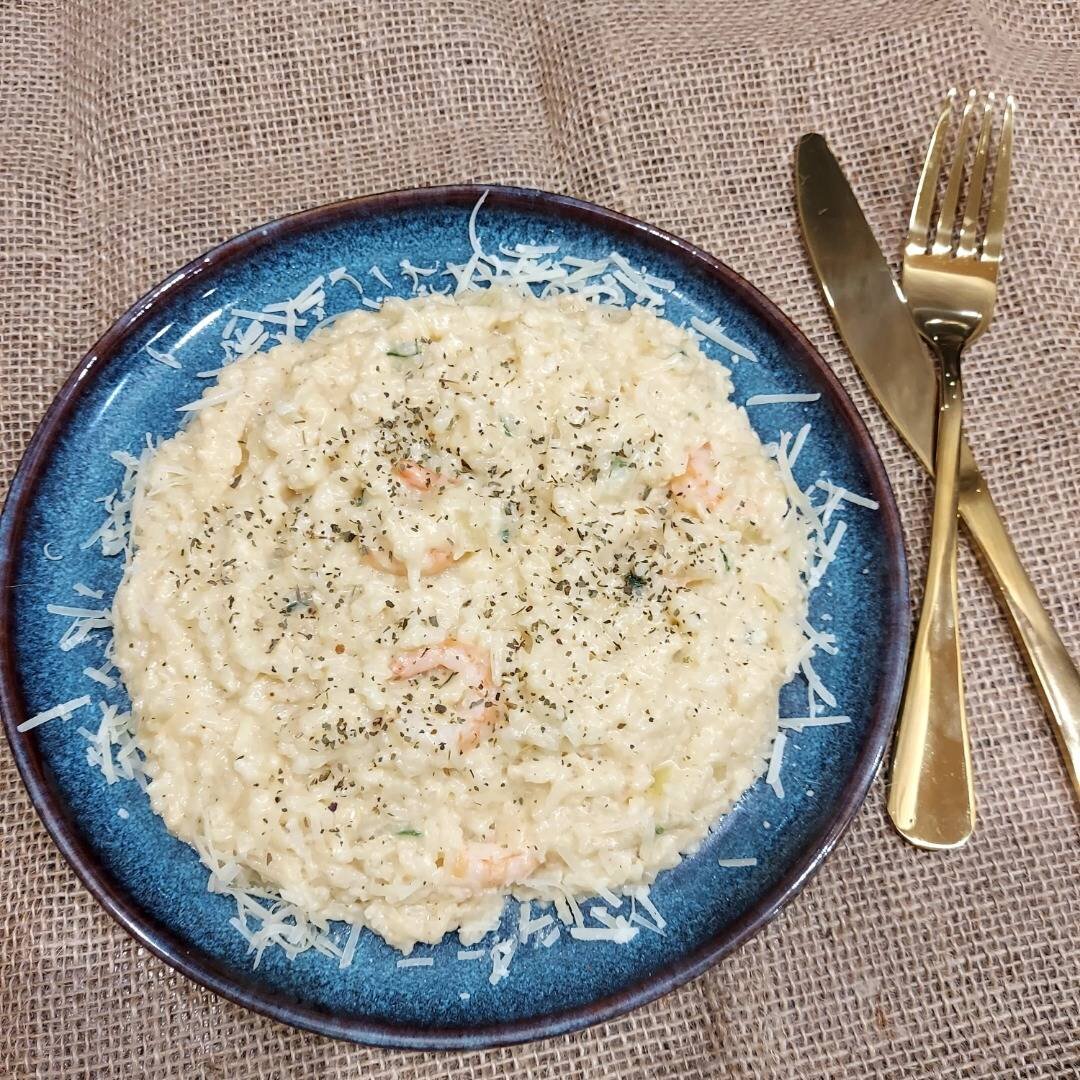 Ингредиенты: риса (или 2 пакетика), креветок, бульона, сыра твёрдых сортов, сливок, луковица, чеснока, оливковое масло, соль, перец, мускатный орех молотый, чили перец молотый Способ приготовления: Если креветки в панцире, отвариваем и очищаем. Если уже очищенные доводим до кипения. На сковороде разогреваем оливковое масло. Лук режем мелко. Чеснок дробим и всё прожариваем до прозрачности лука. В это время хорошенько промываем рис в холодной воде, до прозрачности воды, воду сливаем. Рис отправляем в сковороду и прожариваем с луком и чесноком. В ёмкости горячей водой 700 мл растворяем бульонный кубик. Бульон выливаем к рису. Даём закипеть, уменьшаем огонь и даём рису провариться, сковородку накрыть крышкой. Когда рис будет уже почти готов, добавляем специи, соль, перец и вливаем сливки. Накрываем крышкой, даём рису пропитаться, добавляем креветки и обильно посыпаем тёртым сыром. Подавать сразу.