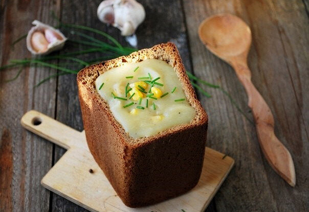 8.Разлить суп в подготовленные хлебные чаши, украсить зеленым луком и немедленно подавать.