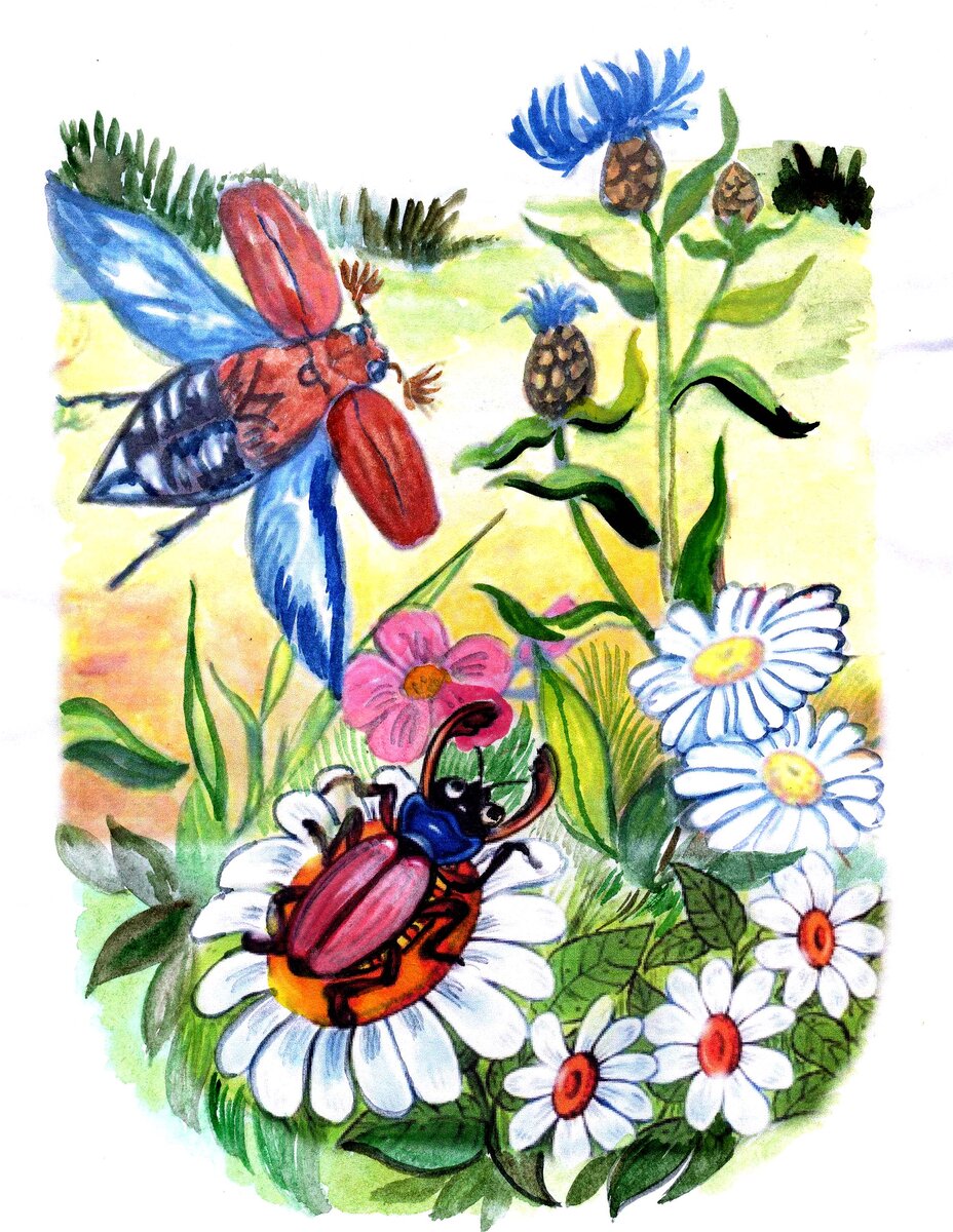 -Давай, Майчок, отправимся в путешествие! Когда мы спускались с тучки, то сверху я видел очень красивую полянку! -О чём ты говоришь! - отвечал Майчок. -Кругом такие заросли репейника, нам ни за что через них не пробраться! Заблудимся ещё... -Эх ты! - засмеялся Хоп. - Ты думаешь, что мы пойдём пешком? А это видел! Хоп приоткрыл вдруг на спинке створки панциря, и оттуда распустились крылышки! Тонкие, прозрачные, но такие сильные. Крылышки быстро-быстро замахали и подняли Хопа над землёй. Он лихо перекувыркнулся несколько раз и закружил над приятелем. Майчок был так изумлён, что даже не мог сначала говорить. А потом загрустил: - Тебе то хорошо! А как же я? - Давай и ты учись летать! Раз я сумел, значит, и ты будешь летать! Майчок немного подумал. Понаблюдал за кружившимся Хопом, напыжился и подпрыгнул. Но у него крылышки даже не раскрылись, и он упал, перевернувшись на спинку. - Ничего, ничего, - успокаивает его Хоп, помогая встать на лапки. -Попробуй прыгнуть с травинки! Майчок влез на с