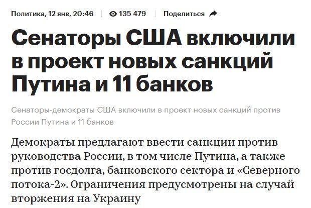 Три этапа переговоров Россия-НАТО не принесли никаких позитивных результатов. США снова пригрозили санкциями в случае наступления России на Украину, и опубликовали их полный перечень. В санкционный список внесли непосредственно российского президента. Что на это ответила Россия? Госп. Рябков, возглавляющий российскую делегацию на переговорах, заявил, что "Россия никогда не прогибалась". "Мы найдем альтернативы, что бы ни было. Россия никогда под давлением не прогибалась, никогда не поддавалась под угрозами и при шантаже" - дословно сказал он. То есть, фактически сказал: "Ну и вводите свои санкции, а мы что хотим - то и будем делать". Но ведь введение санкций предполагается лишь в случае наступления России на Украину. Поэтому участники рынков восприняли это высказывание как сигнал к вероятности такого наступления, а значит - последующего введения санкций, которые обещают быть очень сильными, и бросились распродавать российские активы. Индекс ММВБ за 5 часов рухнул на 3,7% - с 3810 до 36