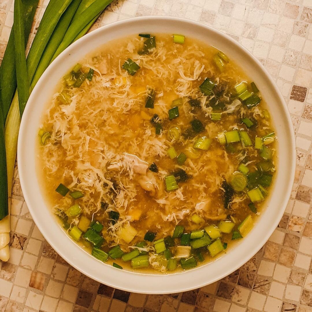 Кукурузный крахмал ( 25 г.) развести в 3 ст.л. холодной воды и влить в кипящий бульон. Помешать, добавить нарезанный зеленый лук, черный перец, посолить если нужно и варить пару минут, пока суп немного не загустеет.