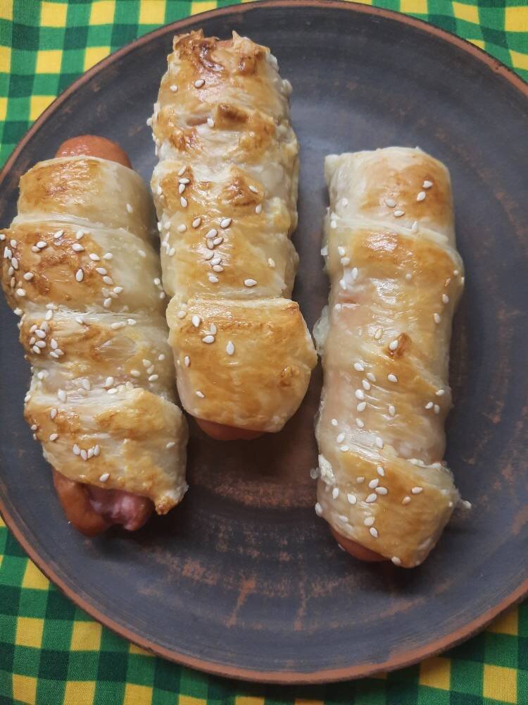 #быстро Ингредиенты: слоёного дрожжевого теста, сосисок, Кунжут для обсыпки, желток Способ приготовления: Тесто разморозить и нарезать на полоски длиной 30 см шириной около 4 см. Сосиску обернуть полоской теста по спирали. Прикрыть полотенцем и оставить минут на 15. Положить сосиски на противень, застеленный пергаментной бумагой. Смазать сосиски взбитыми желтком, посыпать кунжутом и выпекать при 180 градусах 25 минут до готовности. Приятного аппетита. Если Вам понравился рецепт: буду рада увидеть Ваши фотоотзывы и комментарии.