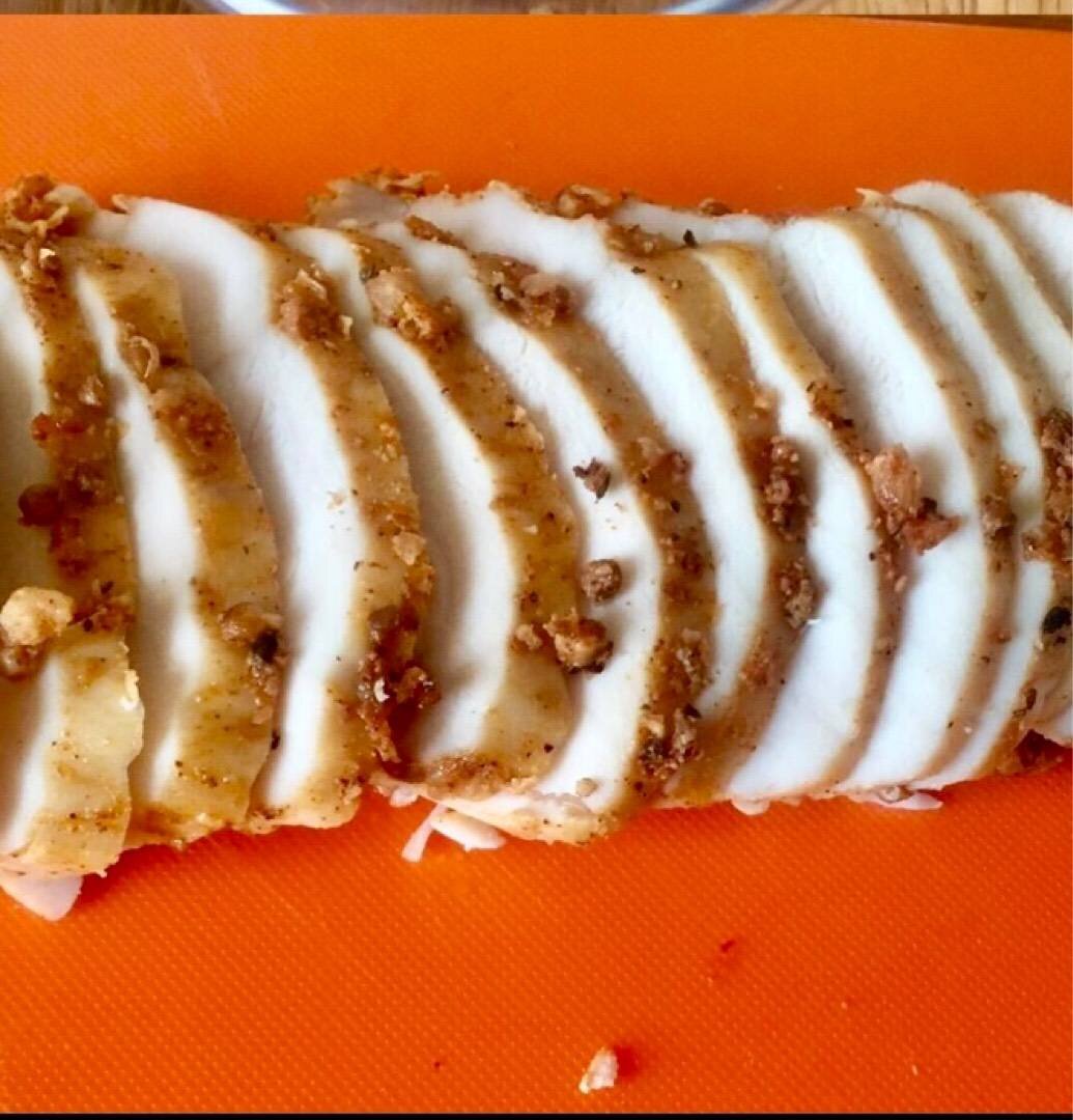 Мясная закуска, которая готовится легко и просто ! Хороша и на праздничный стол, и просто на завтрак. Нежное, сочное мясо, с ароматом паприки и чеснока . Ингредиенты: куриных грудки покрупнее, соли, Чеснок свежий, Красный острый перец и паприка, Кориандр, Вода Способ приготовления: Подготовить филе одной - двух грудок, зачистив от жира и плёнок, и поместить в крутой солёный раствор (примерно 1/3 ст соли на 1 литр воды). Затем слить воду, промыть грудку и обсушить ее. Обмазать специями и чесноком, больше не солить !! Если не торопитесь, то можно ещё дать ей промариноваться. Но можно и сразу готовить. Поставить в разогретую (!!!) до 180 град. духовку ровно на 15 мин, ни минутой больше. Выключить духовку, прикрыть сверху фольгой и дать остыть, не вынимая из духовки. Вынимаем остывшую бастурму и нарезаем острым ножом. Храним в контейнере в холодильнике.