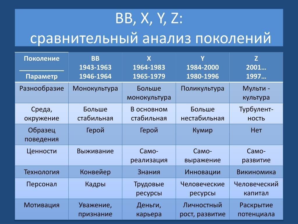 Всем привет! Может, кто-то слышал о теории поколений? Я впервые узнала о ней на молодёжной конференции, организованной на родном заводе, из доклада молодого сотрудника отдела кадров. Среди докладов о технологиях литья сплавов и внедрении информационных технологий в производство, это было просто вау. Очень интересная теория. Суть в том, что все мы относимся к определённому поколению, у которого есть общие черты характера, особенности поведения, мотивации и т.п. Каждые 15-20 лет поколение меняется. Выглядит это примерно так: Самое интересное, что отдел кадров у нас на заводе проанализировал это все дело, вычислил, что основная масса сотрудников поколения Х и Y, и заточил все свои обучения и мероприятия под эти поколения. Причём с поколением X не заморачивались, потому что те пришли и работу работают, а вот поколение Y пришлось заинтересовывать, им личностный рост и развитие подавай)). Сегодня я задумалась: а к какому поколению относятся наши малыши-карандаши? Оказалось, что к поколению