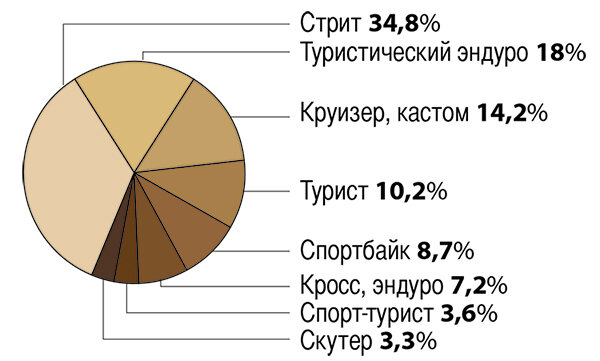 Около десяти лет назад лидерами продаж в России были круизеры, чуть позже пришла мода на скорость и спортбайки, но в результате российский моторынок приблизился к европейским стандартам. Основной объем продаж — практически треть — приходится на дорожные мотоциклы разного калибра. Набирают популярность туристические эндуро (около 20%) и недорогая малокубатурная техника. Постоянно растет доля макси-скутеров — на сегодня это менее 10% от общего объема продаж. Не снижается популярность «асфальтовых» туристических аппаратов — их продажи стабильно держатся на уровне 15%. А вот доля некогда популярных спортбайков сейчас составляет лишь около 10% от общего объема. Продажи всех японских круизеров не дотягивают и до 5%, но Harley-Davidson в 2013 году захватил 8% от суммарного объема продаж мотоциклов. Вообще, доля дорогих аппаратов марок BMW, Ducati, Harley-Davidson и KTM на рынке растет быстрее, чем у японских компаний. Вдобавок на российский рынок вышли новые североамериканские производители мотоциклов Indian и Victory, чьи ценники на мотоциклы обычно удивляют семизначными числами.