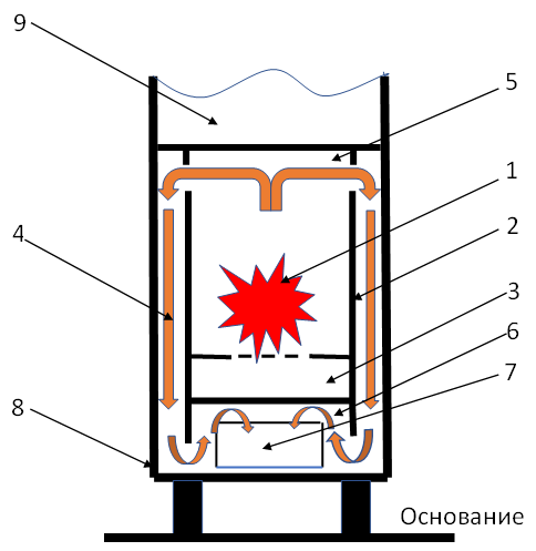 Рассмотрим системы имеющие свойство увеличивать свои выходные характеристики при поступлении на их вход определенной части выходных воздействий в соответствующей фазе и величине*). Поскольку в статье рассматриваются источники тепла поэтому в качестве рассмотрения будет взята кирпичная печь, как одна из многих распространенных источников тепла в повседневной жизни. На рисунке 1 показана схема отопительной печи, на подставках (не менее 3х-6 кирпичей) с тепловыми каналами симметричными относительно топки и «выходным» каналом в задней стенке, что позволит увеличить поверхность теплоотдачи. Рис. 1. Где: 1-источник тепла (например дрова); 2-корпус топки (футеровка); 3-зольник с колосником куда поступает внешний уже подогретый воздух (кислород); 4-схема движения горючих газов; 5-верхний колпак; 6-дополнительный колпак под зольником; 7-выход горючих газов (это может быть вертикальный канал для верхних колпаков); 8- внешний корпус; 9-область для создания внешних колпаков и отведения остаточных