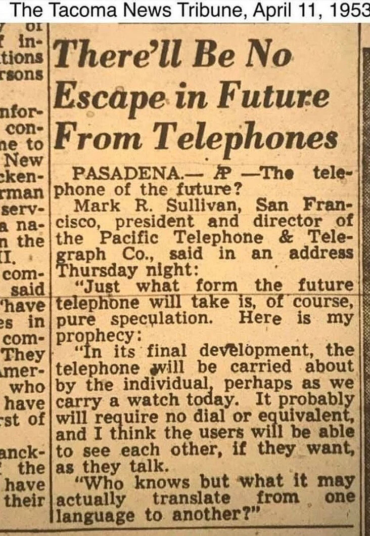 Марк Салливан из калифорнийской телефонной компании PacTel довольно точно описал характеристики современных гаджетов за 40 лет до их фактического появления. В то время Стиву Джобсу, создавшему iPhone, было всего два года. Заметку с описанием смартфона нашли в выпуске газеты 1953 года. В ней Салливан размышляет о том, как изменятся существующие в то время телефоны, пишет PhoneArena. «Какими будут телефоны будущего — это, конечно, чистая спекуляция. Но вот мой прогноз: в своей окончательной форме мы будем носить телефоны с собой, возможно, так же, как сегодня мы носим наручные часы. Телефонам не нужен будет номеронабиратель или его аналог. Пользователи смогут видеть друг друга, если захотят, во время разговора», — говорится в заметке. Только подумайте об этом: за 54 года до презентации оригинального iPhone Салливан предсказал появление портативного телефона с сенсорным экраном (без циферблата), а за 57 лет до дебюта FaceTime руководитель телефонной компании впервые заговорил о ключевой ф