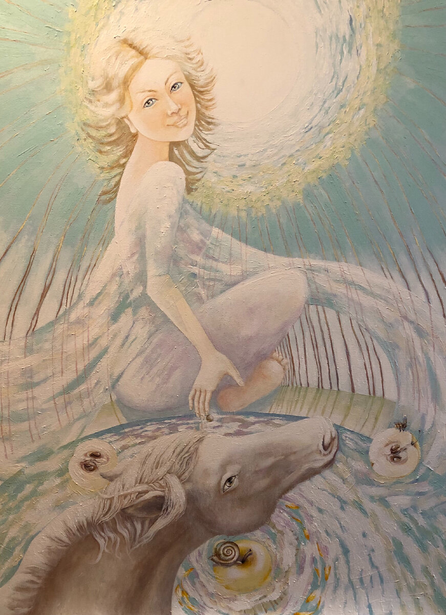 Эта картина, как выход самолета из штопора и уже не понятно, а был ли он... Иногда о каких-то событиях хочется рассказать иносказательно, чтобы не загружать читателя той информацией, которая уже в прошлом и есть только горькое послевкусие на языке, и картина, как позитивная иллюстрация одного момента бытия... Картина « Водопад Света». Вода струится. Небо отражается. Мир живёт в потоке… Свет струится с потолка неба на героиню, поток настолько легкий, невесомый и при этом белоснежный, что кажется сотня прожекторов в одно мгновение зажглась где-то над головой, легким нажатием клавиши, а он продолжает свой легкий бег через все полотно картины и останавливается лишь за ее пределами, так и не дав понять, как ему это удаётся. Свойство света в том, что для него нет преград, попав в самый темный закоулок души он освещает его, и открывает в человеке огромную вселенную, и тогда происходит чудо, мир меняется вокруг. Цвета картины настолько нежны и невесомы, что взгляд плавно скользит по п