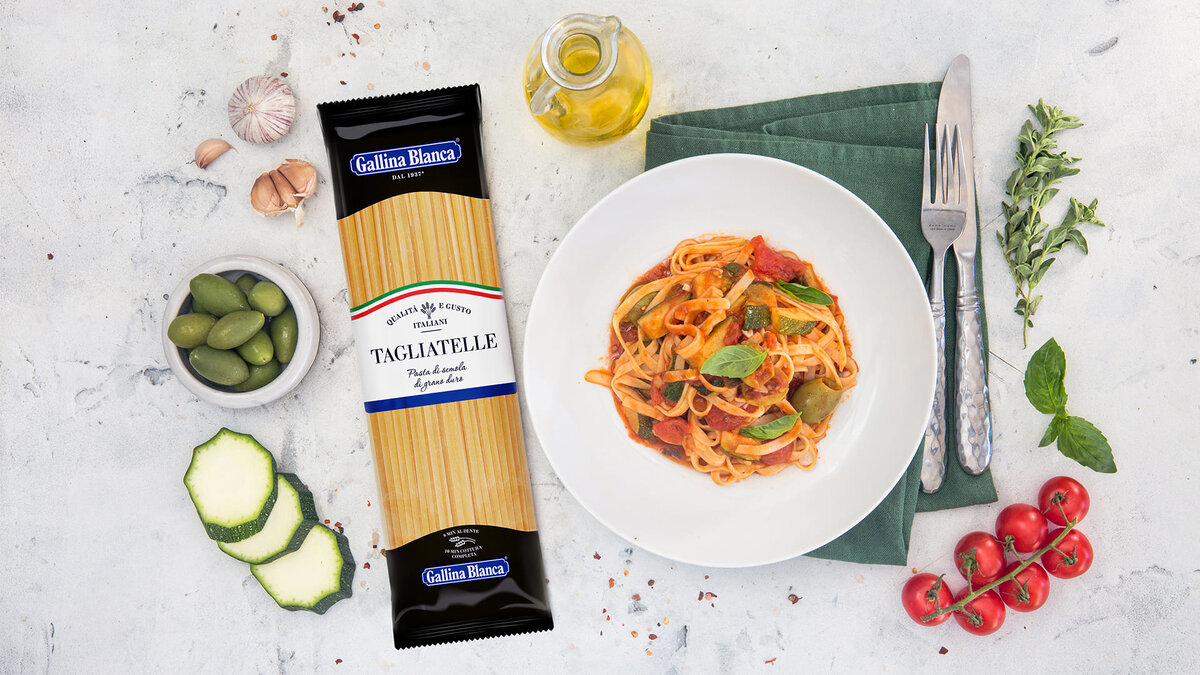 Второе блюдо. Время приготовления: 20-40 минут. Уровень: Лёгкий Ингредиенты Как приготовить Наполетана с цукини Шаг 1 Нарежьте цукини кубиками 1,5-2 см. Раздавите, очистите и измельчите чеснок. В большой сковороде разогрейте масло, положите цукини, обжаривайте на среднем огне, помешивая, до румяной корочки. Шаг 2 Добавьте в сковороду чеснок и анчоусы, перемешайте, чтобы анчоусы немного растворились в масле (1-2 минуты). Шаг 3 Добавьте томаты вместе с соком и оливки, посолите, поперчите, перемешайте, готовьте на среднем огне 15 минут. Добавьте листочки орегано, готовьте ещё 1 минуту. Шаг 4 Сварите «Лапшу» Gallina Blanca в большом количестве кипящей подсоленной воды согласно инструкции на упаковке. Откиньте на дуршлаг и смешайте с соусом. Подавайте немедленно. Больше рецептов на gallinablanca.ru