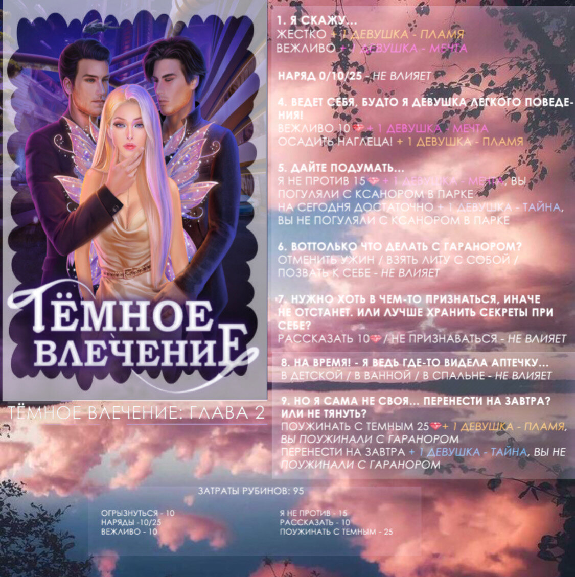 NOVELS 1сезон 2 серия Девушка-Пламя - фаворит Гаранор Девушка-Мечта - фаворит Ксанор Девушка-Тайна - без фаворита Готовый Гайд Ниже я поэтапно покажу вам прохождение по второй главе: Пишите в комментариях, какая новелла вам нравится больше?! Я это учту и буду выкладывать гайд по нужной истории🥰 Приятной и удобной Вам игры!