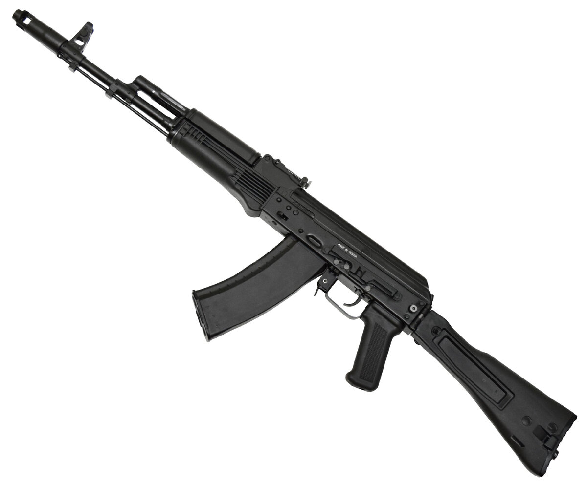 5,45-мм автомат Калашникова образца 1974 года .Автомат калибра 5,45 мм, разработанный в 1970 году советским конструктором М.Т. Калашниковым и принятый на вооружение вооруженнв сил СССР в 1974 году. Является дальнейшим развитием АКМ. Разработка АК-74 связана с переходом на новый малоимпульсный патрон 5,45x39мм. В 1974 году был принят на вооружение Вооруженных сил СССР. Впервые был применён в Афганской войне, далее во всех конфликтах постсоветского пространства. В настоящее время, этот автомат используют большинство стран Восточной Европы, а также Азии. Положительный опыт использования малокалиберного патрона США заставил СССР начать работу по разработке аналогичного автоматного патрона, но уже существовали предложения по разработке малокалиберного патрона. В 1966 году главное ракетно-артиллерийское управление выдало задание на разработку нового автомата под калибр 5,60 мм — так обозначался калибр малоимпульсного патрона по дну нарезов. После принятого в СССР измерения калибра по полям