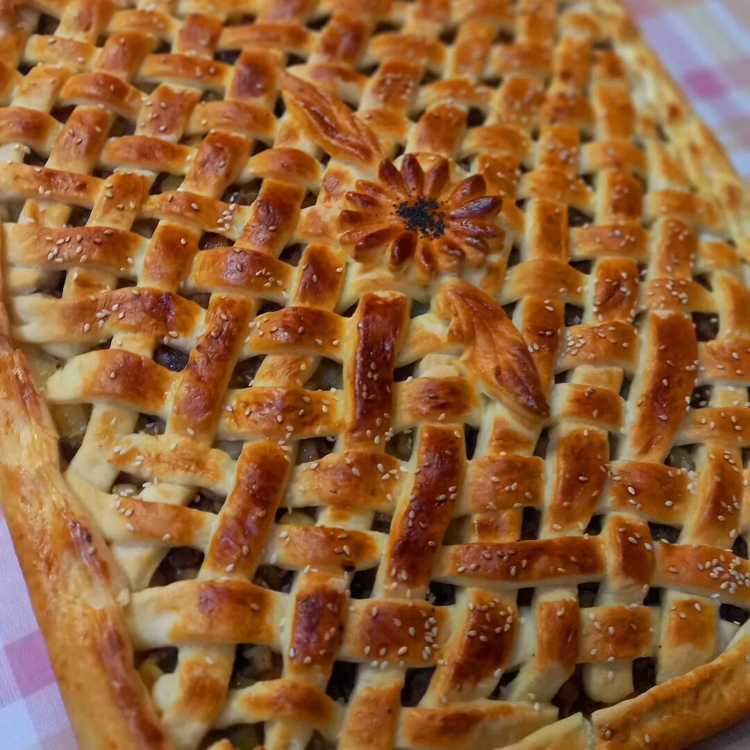 Мясной пирог из говяжьего мяса с луком и картошкой, на сдобном дрожжевом тесте. Этот рецепт на все случаи жизни. Такой пирог готовят для семейного обеда, праздника. Простой в приготовлении пирог , давно полюбили в моей семье. Опара: 1.Приготовить опару для дрожжевого теста. Для этого смешать теплую воду (температура 35–37 градусов), дрожжи, сахар, добавить муку.На 10 мин.в тепло. 2.Для теста : Опара. Мука-450гр(+/-) Вода-1стакан(200мл.тёплая). Соль-1ч.лож. Мас раст.без запаха.-50мл. 3.Убрать в тепло на 1 час. 4.Разделить тесто на две части и раскатать. 5.Начинка: Картошка-2-3шт. Лук-1шт. Мясо(любое)фарш-300гр. Соль,перец.чёр.-по вкусу. Жарим до готовности. Делаем красивое оформление пирога. Начните украшение пирогов из дрожжевого, слоёного или песочного теста с простого, постепенно совершенствуя технику. Выпекать 25 мин.-200°с. Всем желаю удачи и хорошего настроения.Приготовьте пирог по моему рецепту,это просто и очень вкусно.