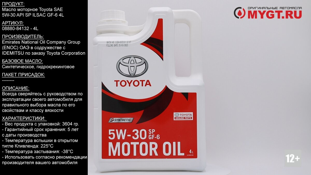 Продукт: Масло моторное Toyota SAE 5W-30 API SP ILSAC GF-6 4L Наш телефон: 8-800-550-57-22 ПН-ПТ 9.00-17.00 (МСК+4) Артикул: 08880-84132 - 4L Производитель: Emirates National Oil Company Group (ENOC) ОАЭ в содружестве с IDEMITSU по заказу Toyota Corporation Базовое масло: Синтетическое, гидрокрекинговое. Пакет присадок: -------- Ссылка для покупки: https://mygt.ru/oil/original-oils-Europe/?dat_field3=toyota+eu TOYOTA SAE 5W-30 API SP ILSAC GF-6 - синтетическое моторное масло высшего качества для бензиновых двигателей Toyota. Облегчает холодный запуск двигателя, обеспечивая надежную смазку пар трения даже при длительной работе в режимах максимальных скоростей и нагрузок. Очень высокий индекс вязкости обеспечивает низкую испаряемость масла, что приводит к уменьшению расхода масла. Предотвращает образование нагаров на стенках цилиндров и поверхностей поршней. Содержит специальный антифрикционный модификатор, уменьшающий трение в двигателе, ощутимо снижая расход топлива