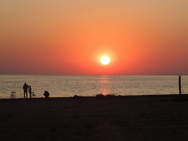 Я просыпаюсь рано, примерно в 5.00, ещё солнышко только, только всходит. Привычно прогуливаюсь по набережной, иногда ловлю редкие кадры. Рыбаки уже заняты своим любимым делом. А я делаю зарядку, день начинается, и похоже будет хорошим. Арина идёт на пляж, она очень любит купаться в море и загорать. Но пока нам не везло, бывает. Сегодня с утра небо чистое, солнышко начинает припекать. А вот и пляж кемпинга, что то народу мало, надо разобраться, Арина зовёт деда. Ну как отказать любимой внучке, идём все вместе купаться. Вода то тёплая, но вся в траве. Трудно плыть, да и не приятно, когда трава лезет в рот. Море не похоже на море, оно должно быть синим, а не чёрным. Хотя я не прав, море же называется Чёрным, так какие же претензии к морю. Теперь понятно почему мало купающихся, снова невезуха. Арина слегка расстроена, хотела рыбок половить, приготовила сачок. Мы узнали , если проехать дальше по Бакальской Косе километра 3, то там можно купаться. Мы тут же поехали искать это место. Ари