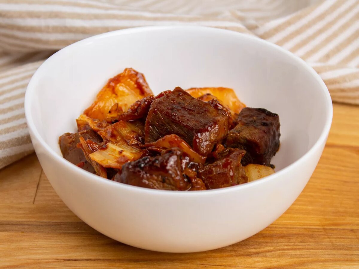 Тушеная говядина с кимчи — отличное и сочное сочетание. Ароматное рагу отлично подходит для холодных зимних дней и весенний период, но корейцы могут съесть его в любое время и в любом месте. Это одно из самых популярных рагу в Корее и подается во многих блюдах и в традиционных ресторанах. Корейцы считают, что самый яркий и насыщенный вкус и аромат блюдо приобретет, если его приготовить из так называемого «старого», хорошо настоявшегося кимчи. Калорийность - 177,08 ккал Белки - 5,86 г Жиры - 13,88 г Углеводы - 7,51 г ПРОДУКТЫ Капуста кимчи 0.3 кг = 300 г Говядина 0.15 кг = 150 г Растительное масло 30 мл = 30 г Кунжутное масло 30 мл = 30 г Соус унаги 60 мл = 60 г Чеснок 2 зубчик = 8 г Соус кимчи 3 ст. л. ПОШАГОВЫЙ ФОТОРЕЦЕПТ ПОДГОТОВИТЬСЯ Выложите все ингредиенты для начинки. Заранее замаринуйте пекинскую капусту и промойте говядину. НАЧАТЬ ГОТОВИТЬ 1. Нарежьте говядину кубиками. 2. Мелко нарежьте чеснок. Разогрейте растительное масло на сковороде. На среднем огне в течение 5 минут обжар