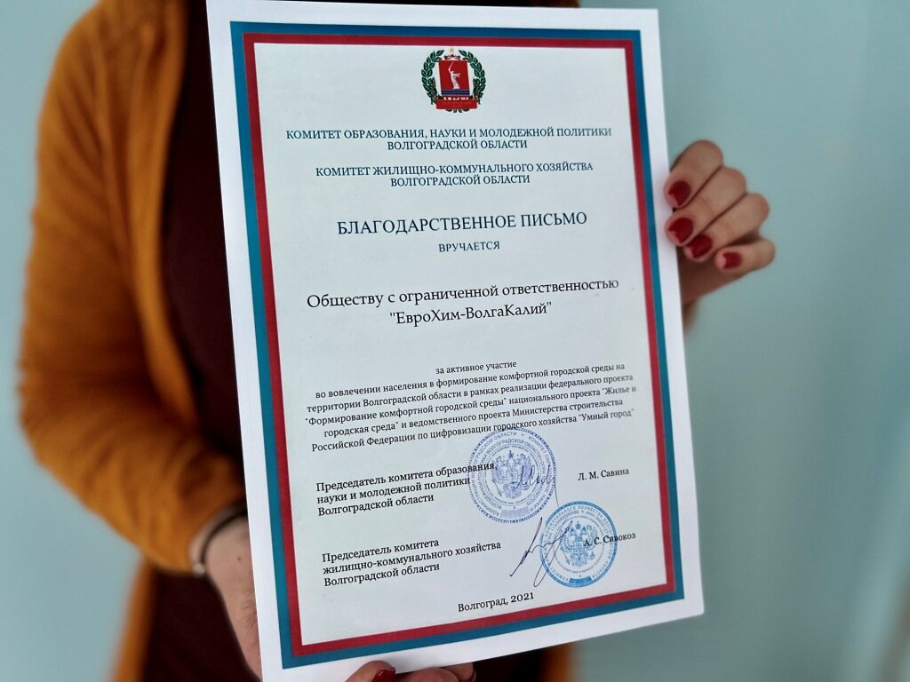 Комитет образования, науки и молодежной политики администрации Волгоградской области выразил благодарность «ЕвроХим-ВолгаКалию» за активное участие в формировании комфортной городской среды на территории Волгоградской области. Большую социально важную работу дочернее предприятие компании «ЕвроХим» российского бизнесмена Андрея Мельниченко ведет одновременно с развитием производственных мощностей Гремячинского горно-обогатительного комбината.«ЕвроХим-ВолгаКалий» возводит в городе Котельниково современные жилые районы и строит социальные объекты, предназначенные для всех котельниковцев, модернизирует городскую инфраструктуру, способствует реализации важнейших гражданских инициатив населения в соответствии с принятой программой повышения уровня жизни населения региона. В частности, благодаря эффективной совместной работе населения органов власти и «ЕвроХим-ВолгаКалия» в рамках «Всероссийского конкурса лучших проектов создания комфортной городской среды в малых городах» планируется возвест