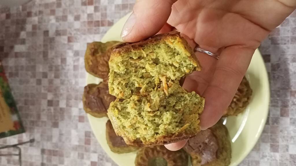 Тыквенная мука очень полезна, там много витаминов и микроэлементов. У меня она вот такая зеленоватая. Вкус тыквенных семечек. А в сочетании с морковью- полезно и интересно на вкус. Ингредиенты: моркови, кефира, растительного масла, мёда, яйца С2, рисовой муки, тыквенной муки, разрыхлителя Способ приготовления: Яйца взбить с мёдом. Влить постепенно масло, продолжая взбивать. Затем влить кефир, взбить. Морковь потереть на мелкой тёрке и выложить в нашу смесь. Муку рисовую + тыквенную + разрыхлитель. Всыпать муку в смесь с морковью, перемешать. Выложить в формочки и выпекать на среднем огне до готовности.