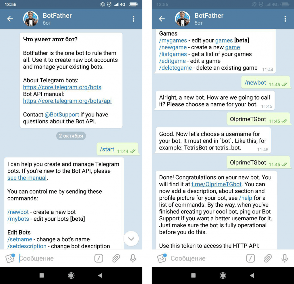 Самая простая и описанная часть. Очень коротко: нужно найти бота @BotFather, написать ему /start, или /newbot, заполнить поля, которые он спросит (название бота и его короткое имя), и получить сообщение с токеном бота и ссылкой на документацию. Токен нужно сохранить, желательно надёжно, так как это единственный ключ для авторизации бота и взаимодействия с ним.