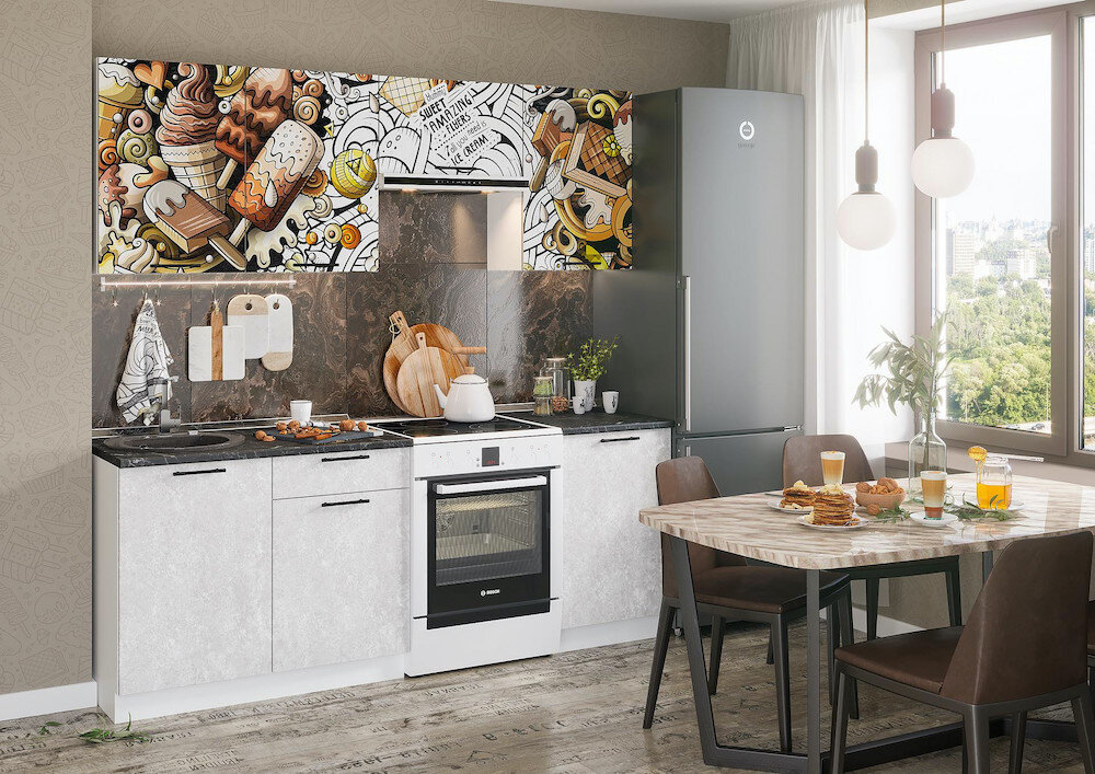 Гарнитур с фотопечатью – это возможность сделать интерьер оригинальным, при этом не нужно будет отделывать стены.