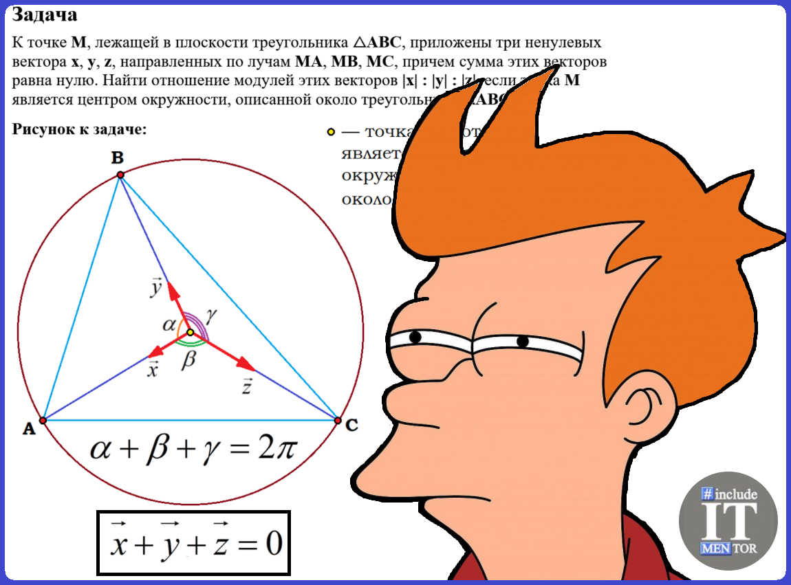 Что ж, задачка и правда интересная... Как к ней можно подступиться? Проецироваться вектора? Вспомнить теорему синусов? Попробовать расписать площади через векторное произведение каждой пары векторов? Использовать скалярные произведения? Или же всё может быть проще... Давайте разбираться.