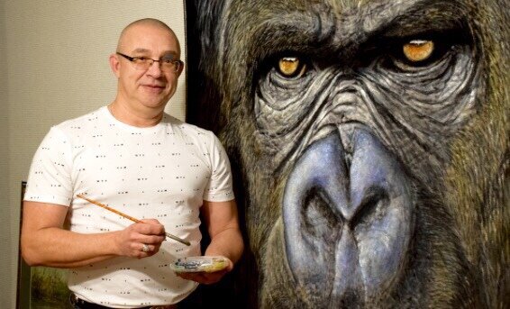 А теперь посмотрим на мир вокруг глазами художника-анималиста. Как известно героями подобных картин становятся звери и птицы. И выглядят работы настолько реалистично, что их сложно отличить от фото. Вера Куликова побывала в гостях у владимирского анималиста Германа Шамаева и готова удивить вас его картинами. И они - не на холстах. Взгляд. Магнетический, пронзительный, глубокий. Такого эффекта и пытался добиться художник Герман Шамаев- автор картины "Страж". Горилла призвана охранять дом. Чужие должны понимать: хозяева под надежной защитой. Анималистика в творчестве Шамаева появилась неслучайно. Герман уверен: к братьям нашим меньшим нужно относиться как к равным. Герман Шамаев, художник: «Для меня изображение животных-это еще и некий призыв, наверное, к тому чтобы к ним относится бережно! Тем более, если посмотреть на это с точки зрения охоты?! Я вообще против охоты!)) В галерее- изображения верблюдов, лошадей, зебр, ягуаров, горилл, жирафов. Для достоверности художник разработал ноу-х