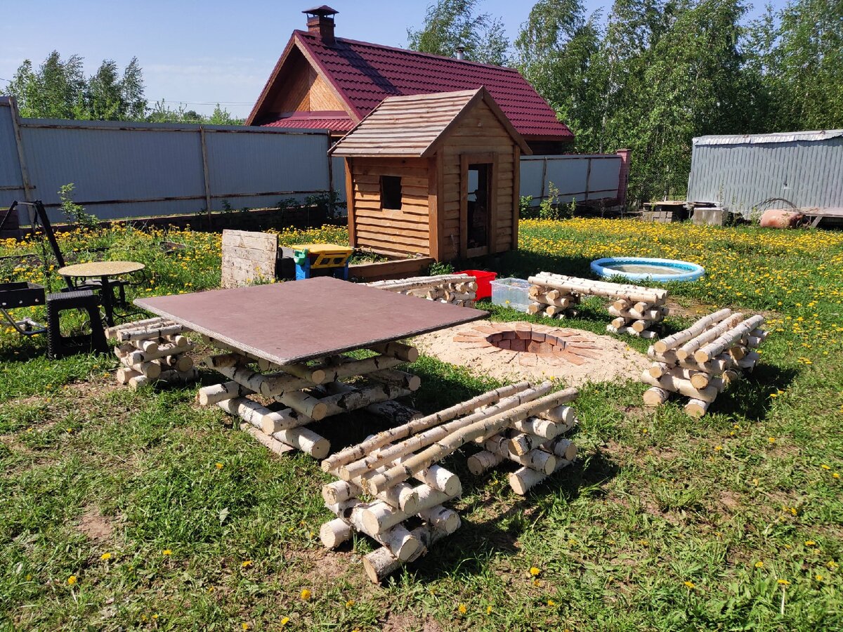 Как сделать зону отдыха почти из ничего. Расскажу свою историю. и как камне пришла эта идея. В разгар пандемии все кафе были закрыты, а тут у нашей дочери выпускной в школе. и вот задача, где и как организовать праздник для детей. Тут и пришла нам с женой идея, что это можно сделать у нас на участке за домом, в это время сосед рядом снами очищал свой участок от деревьев под строительство дома, и все срезанные березки свалил в кучу, мне пришла идея, почему бы не изготовить из брёвнышек скамейки и столик. Напилив заготовки для скамеек и, съездив в магазин за гвоздями на 150, сделал первую скамейку, получилось не плохо, потом сделал остальные, стол решил сделать в том же стиле, благо остался лист фанеры после строительства дома из него и сделал столешницу для стола. Выкопав небольшую яму и обложив ее кирпичём, который также остался после строительства, и получилась костровая яма. Вот так подручными средствами у нас появилась не большая зона отдыха, детишкам очень понравилось!