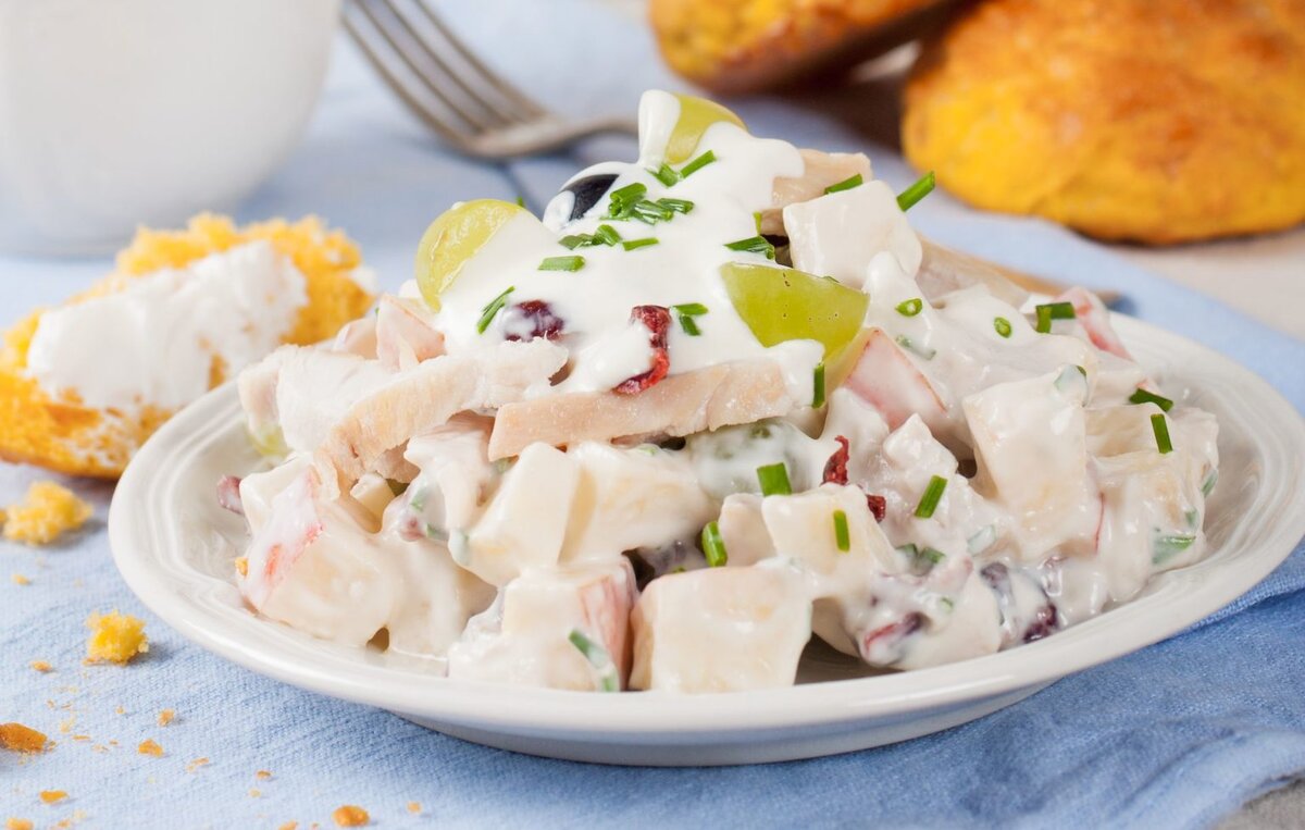 соль, перец по вкусу. Рецепт пошагово Куриное мясо без костей и шкурки отварить в слегка подсоленной воде, остудить, мелко порезать. Измельчить яблоки, крупный виноград порезать половинками. Клюкву разморозить или промыть, промокнуть бумажной салфеткой. Смешать в салатнике все компоненты блюда и заправить натуральным йогуртом. Посолить и поперчить, если желаете. Перемешать и подать к столу. Приятного аппетита!