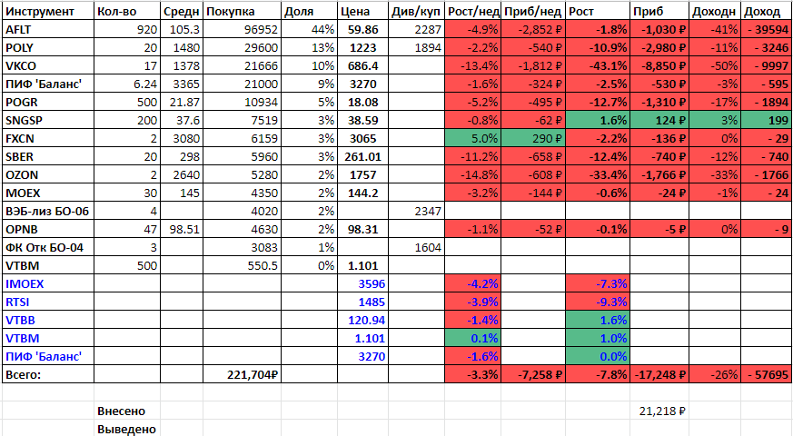 Вторая торговая неделя года и седьмая неделя инвестирования в прямом эфире Дзена омрачилась глобальной просадкой рынка на геополитических новостях, радует только факт, что мой портфель держался лучше основных индексов: Убыток за неделю: -7 258 рублей Убыточность портфеля за неделю: -3.3% Доход с начала инвестирования: -57 695 рублей Убыточность портфеля с начала инвестирования: -26% Общий размер инвестиций: 221 704 рубля Сравнение с бенчмарками (с начала публикаций): Мой инвестиционный портфель: -7.8% IMOEX: -7.3%, RTSI : -9.3%, VTBB: 1.6%, VTBM: 1.0%, ПИФ 'Баланс': 0.0% Портфель на неделе держался лучше почти на 1% чем IMOEX, поэтому результат с ним практически сравнялся. По-прежнему управляющие ПИФ "Баланс" справляются с инвестированием лучше меня (хотя и у них приличная просадка), мне есть к чему стремиться :) Позитив недели: На 5.0% за неделю вырос БПИФ китайского фондового рынка (FXCN) и принес в копилку 290 рублей при своей скромной доле в портфеле в 3%. Китайский рынок чувствует