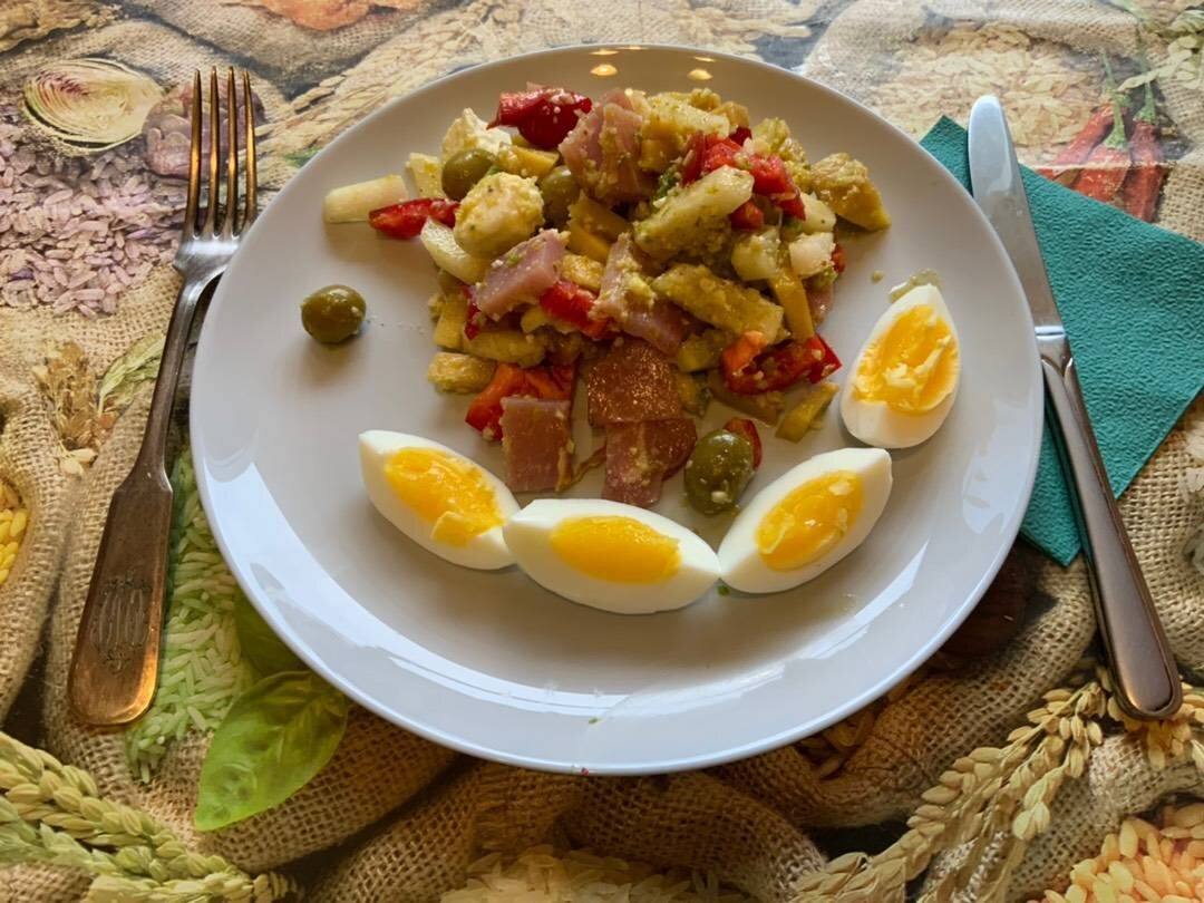 Ингредиенты: гр с/к балыка, гр адыгейского сыра, сладкий перец, крупная груша, манго, авокадо, яйца, маленькая банка оливок (у меня - с лимоном), Половинка огурца, Заправка:, маленьких черешков сельдерея, мандарин, гр персикового сока, гр любого твёрдого сыра, неполная ст. ложка соуса песто, оливкового масла, жидкого мёда, ложка тростникового сахара, по вкусу Соль, перец Способ приготовления: Отвариваем яйца (я варил 5 мин после закипания). Чистим их. Подготавливаем остальные продукты. Нарезаем мясо, Адыгейский сыр и сладкий перец. Чистим, нарезаем огурец и грушу. То же самое делаем с авокадо. И манго. Добавляем оливки без рассола. Крошим острый перец, чистим мандарины от кожуры, семян и белых плёнок. Нарезаем сельдерей и сыр. Все кладём в чашу блендера, добавляем песто, сахар, персиковый сок, мёд, оливковое масло. Пробиваем. Пробуем, по-необходимости досаливаем. Мне хватило солёности песто. Заправляем салат, даём полчаса настояться. Режем яйца на четвертинки и подаём. Вуаля!