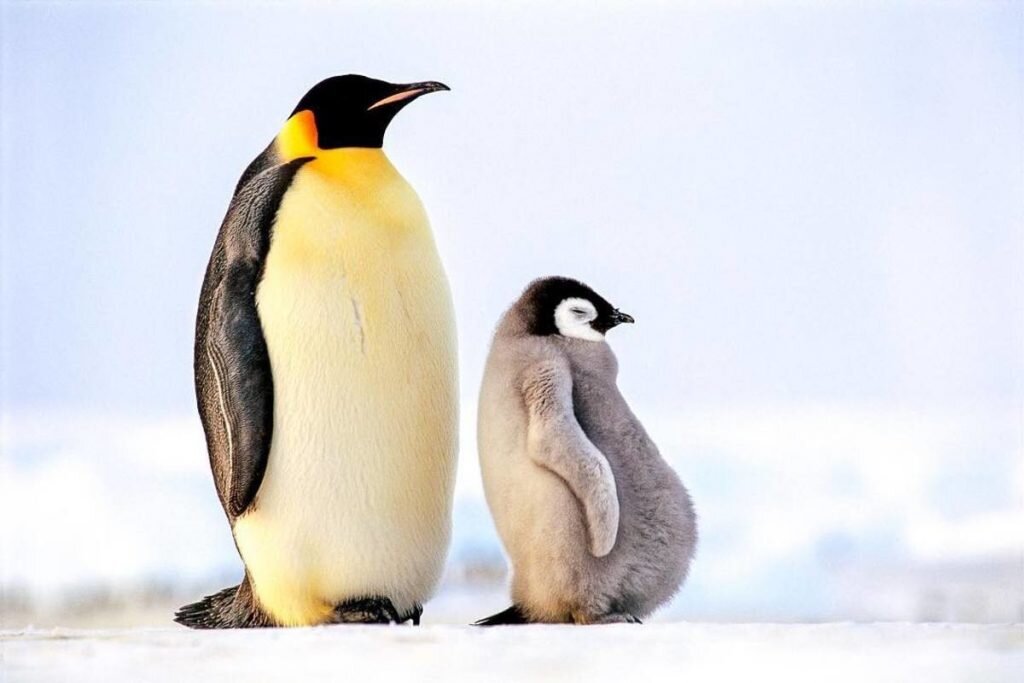 Императорский пингвин. Не все птицы могут летать. Пингвин, например, не летает, в своей белой манишке, черном фраке он похож на человечка. Ходит на лапка, смешно переваливаясь, а крылья пингвинов превратились в ласты, они нужны им, чтобы плавать. Пингвины могут долго плавать и нырять в ледяной воде. Императорский пингвин живет в Антарктиде, где всегда царит зима. Описание пингвинов. Перья у пингвинов короткие, но они плотно прикрывают тело, словно шапка, но главная защита от морозов и холодных ветров-солидные запасы жира под кожей. Живут пингвины большими стаями и охотиться тоже компанией, так легче защищаться от врагов, кто-нибудь обязательно заметит опасность и предупредит остальных. Ожидание потомства. Если все птицы высиживают своих птенцов, то про пингвина можно сказать, что он их выстаивает. У мамы, императорского пингвина всего 1 яйцо, папа пингвин радуется ему, машет крыльями, кланяться, может быть благодарит жену, и осторожно кладет яйцо себе на лапки, а сверху прикрывают б