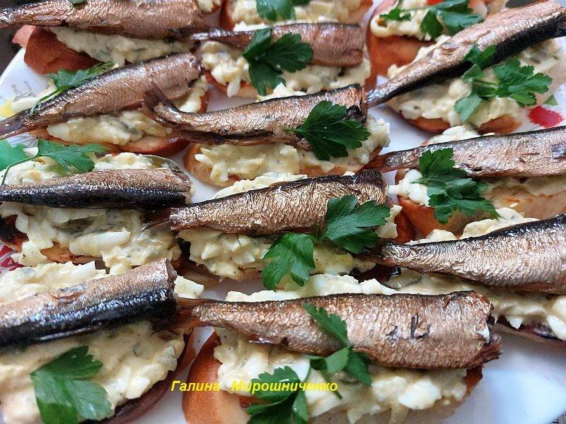 #быстро Бутерброды со шпротами - одни из самых распространенных. Имея в холодильнике баночку шпрот можно быстро приготовить вкусные бутерброды, используя разную основу. Ингредиенты: батона, шпрот, вареных яйца, маринованных огурца, чеснока, сырного соуса "Heinz", растительного масла Способ приготовления: Батон нарезать или взять нарезной. Ломтики батона подсушить с одной стороны на сковороде, смазанной растительным маслом. Яйца и огурцы натереть на терке, чеснок пропустить через пресс. Добавить сырный соус и перемешать. Ломтики батона намазать смесью, сверху выложить рыбку, украсить зеленью. Приятного аппетита!