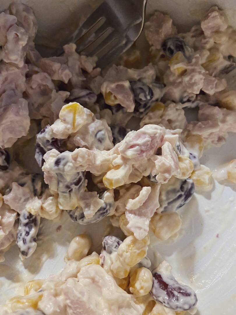 Ингредиенты: Копченая курица (с магазина), Кукуруза, Фасоль, Майонез Способ приготовления: Разделать и Нарезать курицу. Добавить кукурузу. Слить воду с фасоли, промыть, добавить. Смешать всё с майонезом, не забыть посолить. Готово! Можно добавить так же тертый сыр :)