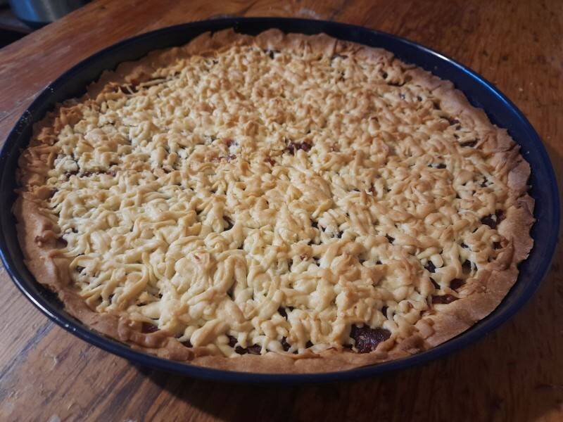 Ингредиенты: Сливочное масло , Желтки , Сахар , Сода, Уксус 9% , Мука , Начинка : , варенье, джем Способ приготовления: Приготовление песочного теста Берём желтки и взбиваем их с сахаром до бела, затем добавляем туда сливочное масло комнатной температуры и взбиваем до однородной массы, после нужно соиденить соду с уксусом и добавить в сливочную массу, когда все готово добавляем муку и замешиваем мягкое пластичное тесто, теперь кладём тесто в пакет и ставим в холодильник на 2-5 часа, или в морозилку на 1-3 часа Оформления пирога, после того как тесто охладилось, делим его на 2 части одна большая (3/4 часть) и одна маленькая (1/4 часть). Большую часть раскатываем большую часть теста и выкладываем в форму (у меня 32 см), заливаем вареньем и сверху натираем на крупной тёрке маленькую часть теста. В разогретую духовку до 200-230 градусов ставим пирог на 20-30 минут, затем вынимаем из духовки но не вынимаем из формы, после того как пирог остынет его можно украсить сахарной пудрой ♥️ Если буд