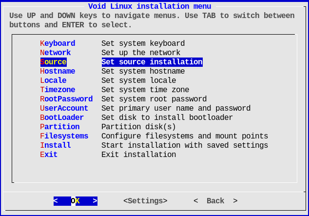 Запускаем инсталлятор командой sudo void-installer