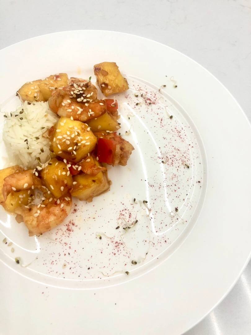 Это очень быстрое и нежное блюдо, его можно подавать как отдельно, так и с рисом как основное блюдо #быстро #салат #ужин Ингредиенты: очищенных креветок, спелого манго, Сок 1/2 лимона, маленькая луковица, чеснока, спелой паприки, острого перца (по желанию), Соевого соуса, Кисло-сладкого соуса Wok для жарки, Растительного масла для жарки, Кунжут, Рис отварной по желанию на гарнир Способ приготовления: Разогреваем масло и жарим лук. Через минуту отправляем туда креветки, чеснок, острый перец, соуса соевый и кисло-сладкий, сок лимона. Жарим буквально 3 минуты до того момента как креветка приобретёт розовый цвет. Теперь отправляем паприку и манго, предварительно подрезанные на средний кубик и жарим буквально 1 минуту. Убираем с огня и посыпаем кунжутом. Подаём с рисом или на подложке из имеющихся листьев салата. Приятного аппетита !😋