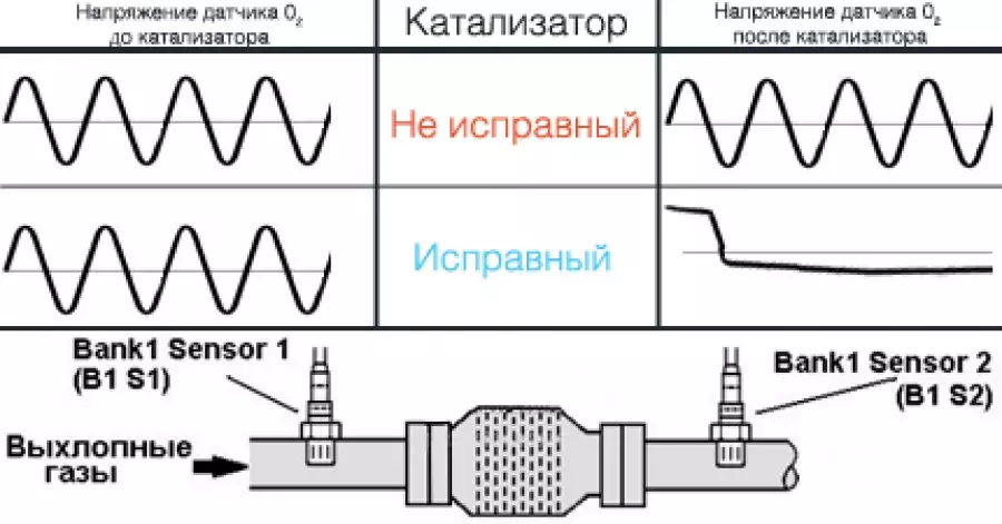 Это два одинаковых кода,в зависимости от того сколько катализаторов у вас стоит. Прежде чем менять катализатор нужно! 1.Первое что вы должны смотреть,это коды осечки,коды датчика кислорода,датчика МAF,вообщем все что может повлиять на ваше соотношения топливно-воздушной смеси. 2.Утечка охлаждающей жидкости не часто,но бывает причиной. 3.Это проверить утечки выхлопных газов. 4.Проверить температуру переднего сварного кольца,и заднего,если на переднем нет 260 градусов,то возможно он не получает правильной газовой смеси.Заднее кольцо должно быть на 150 градусов больше.Если такого нет,то убит катализатор. 5. Форма волны должна быть как на рисунке выше.Если 2 датчик дублирует 1,и волны одинаковые,значит то что входит,то и выходит,и нет каталитической реакции.Это означает что катализатор умер. Еще один м