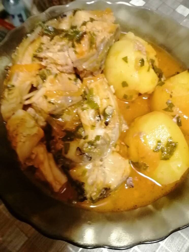 В мясе карпа содержится масса ценных веществ. Это витамины С, А, Е, РР и группы В, хлор, магний, цинк, фтор, никель, натрий, йод, железо, хром, кобальт, марганец, белок, жирные кислоты, аминокислоты. Чем полезен карп для здоровья? Регулярное употребление этой рыбы способствует укреплению сосудов и сердечной мышцы, укреплению костей, снижению вероятности развития онкологии. Ингредиенты: Карп крупный, Картофель, Томат. паста, Зелень, Соль, паприка, Лук, Масло сливочное Способ приготовления: Берём большого карпа не менее 3 кг, это для того, что чем больше карп, тем меньше костей. Очищаем его, обрезаем хвосты, жабры и вынимаем внутренности. Кстати маленький лайфак. Чтобы карп легче очищался, надо ошпарить его горячей водой. Разделываем его на стейки и отрезаем голову. Голова нам потом пригодиться на суп. Картофель средних размеров очищаем. Берём казан или кастрюлю. На дно казана складываем стейки. У меня их 5 штук. Остальные я убрала. Сверху кладём картофель целиком и наливаем немного воды