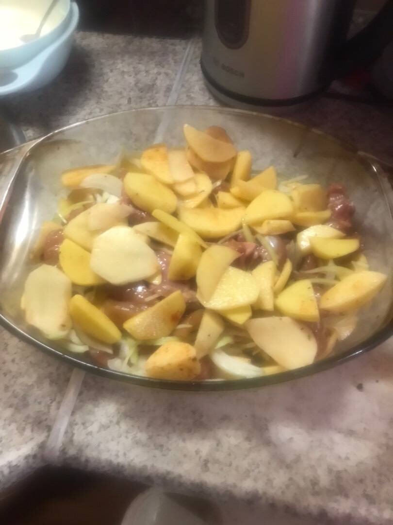 #быстро Ингредиенты: Филе куриное, Картофель, Лук репчатый, Соевый соус,соль,специи по вкусу, Сметана,майонез по 3 ст.л, Растительное масло для смазывания формы Способ приготовления: Филе режем на небольшие кусочки, добавляем соль, специи и соевый соус. Все перемешиваем и оставляем мариноваться на час (можно и сразу готовить). Режем картофель кружочками,лук полукольцами. Форму смазываем маслом. Картофель солим,добавляем приправы по вкусу. Выкладываем половину картофеля в форму. Далее идёт слой куриное филе и лук. Добавляем вторую половину картофеля. Добавляем соус (сметана и майонез). Отправляем в разогретую до 200 гр. духовку и тушим до готовности (минут на 10 до готовности можно добавить сыр).