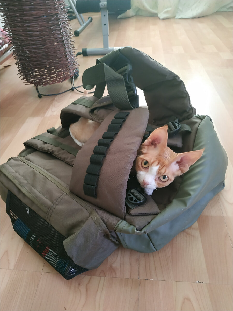 С вечера кот очень переживал, что его не возьмут, и настырно залезал на рюкзак: