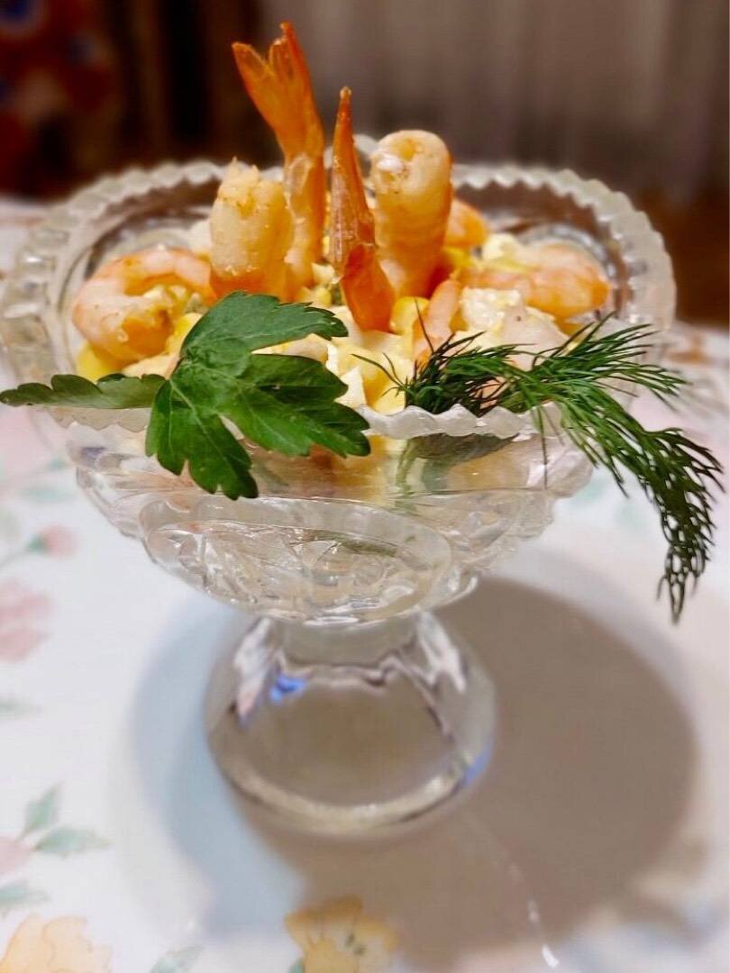 Этот салат лучше всего подавать порционно, выглядит очень эффектно, за праздничным столом съедается первым . Ингредиенты: креветок, яйца, свежий огурец, кукурузы, Майонез, Зелень для украшения, королевских креветок Способ приготовления: Креветки и яйца отварить, почистить. Яйца и огурец нарезать. Добавить очищенные креветки, кукурузу и майонез. Все перемешать и разложить по креманкам. Украсить каждую порцию парочкой королевских креветок (очищенных не до конца, на хвостике оставить панцирь) и веточками зелени. Для особых гурманов - ещё и долькой лимона.
