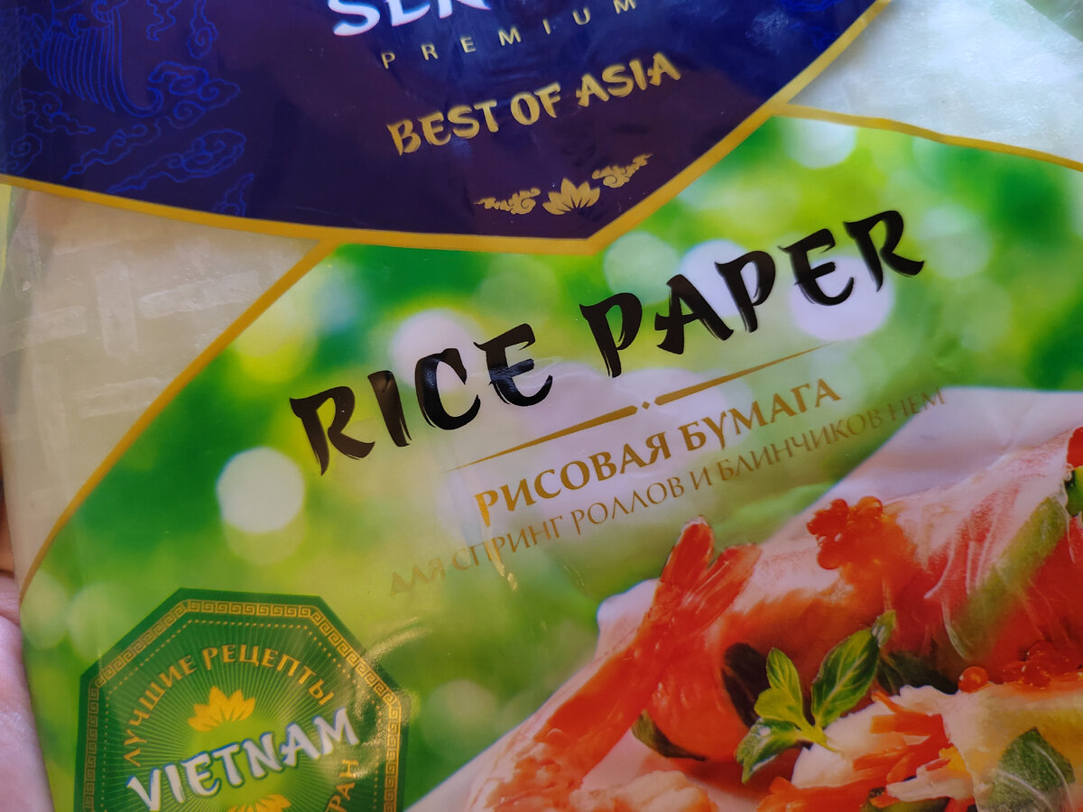 Сегодня у меня была премьера, впервые готовила такие блинчики. И первый блин вышел совсем не комом. Рисовую бумагу я купила в отделе товаров для азиатской кухни. Цена - меньше 100 рублей, точнее не вспомню. Внутри было 10 полупрозрачных круглых листов. Я решила попробовать сделать несколько штук, а именно, четыре. И вот что мне понадобилось на эти 4 блинчика: Дополнительные ингредиенты: - Растительное масло для обжарки - Соус терияки для подачи. Приступаем! Сначала подготовила начинку. Креветку нарезала на небольшие кусочки. Кунжут слегка подсушила на сковородке. Очень мелко порезала перец и имбирь. Смешала все. В начинку можно добавить свежей зелени, кинзу или лук. Как размягчить рисовую бумагу? Я четко следовала инструкции на упаковке. В миску с диаметром блинчика налила теплой воды. В неё надо положить лист и подождать несколько секунд. Как только бумага стала пластичной, достала. Гладкой стороной положила вниз и поместила в центр блинчика столовую ложку начинки. Плотно