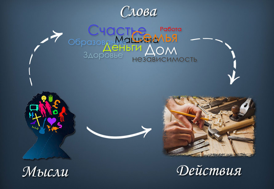Хорошо, на чем были основаны ваши слова? Любые слова рождаются из мыслей: вы о чем-то подумали, а потом озвучили. Средство мысли первично в процессе появления материального объекта,а сам процесс протекает по схеме мысль – слово – действие – результат... Так материализуются наши мысли.