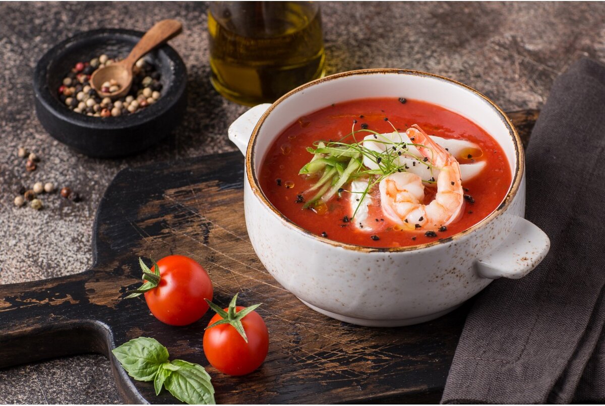 - Рыбный бульон лучше процедить - вдруг где косточка выварилась - и добавил к нему пюре из блендера, кусочки рыбы и кальмара, аккуратно перемешал. Дал пару минут покипеть и добавил остальные морепродукты. Креветки и мидии можно добавить прямо перед подачей. Украшаем зеленью и подаем.