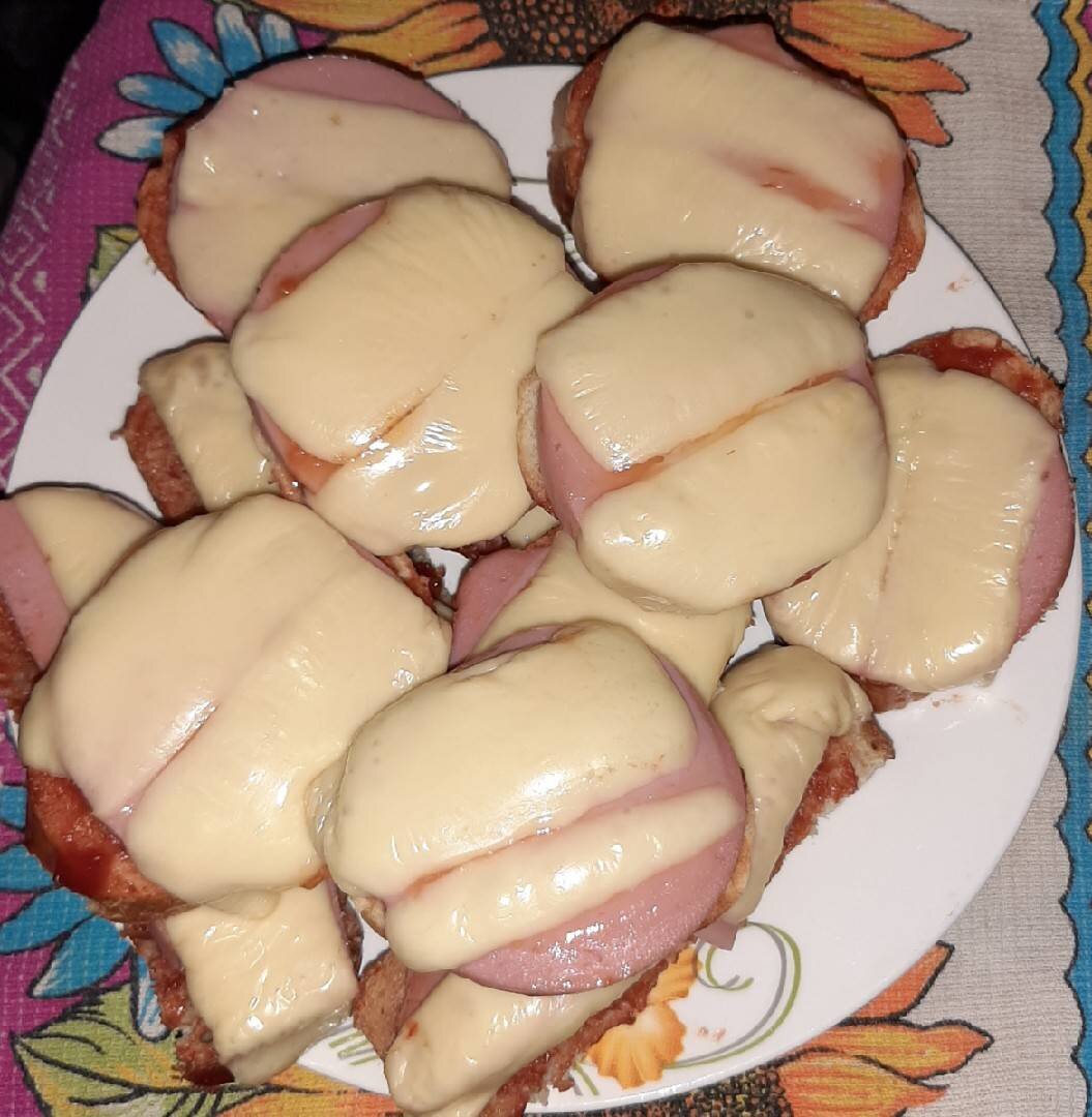 #быстро Я думаю, это самый распространённый вариант закуски быстрого приготовления. Горячие бутерброды всегда улетают в первую очередь. Этот вариант самый наипростейший. Ингредиенты: Багет, Кетчуп, Колбаса, Сыр гауда Способ приготовления: Включить духовку на 200°. Нарезать багет. Каждый кусок смазать кетчупом. Положить на каждый кусок колбаску. Поверх колбасы по 2 слайса сыра. Запечь в духовке при температуре 200° 15 мин.